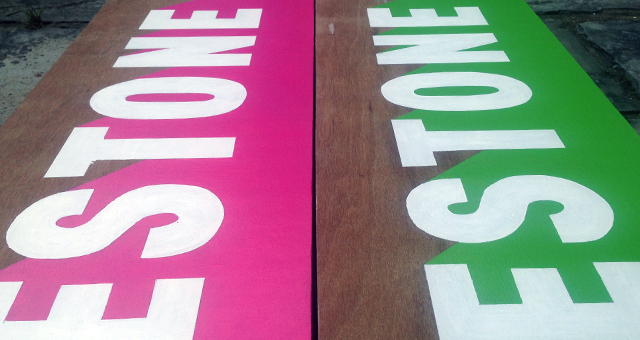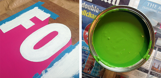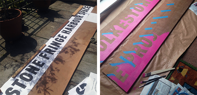 The drop shadows were painted in first. Pink and green were chosen for the colours to tie in with that of both the Folkestone Fringe and Open Fringe Festivals. White then infilled the letters to give it a bold finish. Masking tape was used to ensure a crisp edge.