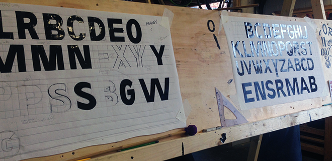 The process took five days in total, beginning with cutting down a huge piece or marine ply into 3m long sections, two making up each sign. These were then sealed and the templates were applied. The weather quickly turned for the worst so I had to take everything inside and invade my parents living room!