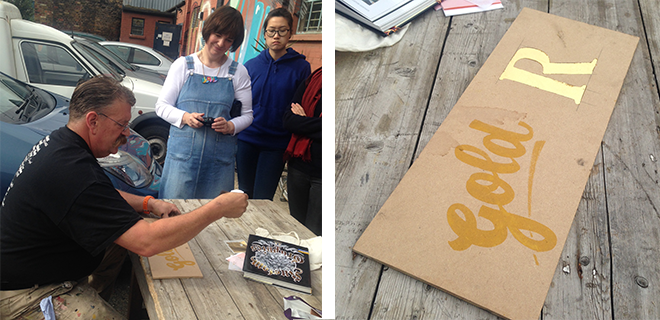 Day 1: After an introduction by Mike, and a large ingestion of chocolate (he loves Cadbury's), the morning consisted of looking at Gothic lettering and how to construct letterforms with the use of a basic hand sketched grid. We created the grid by using the Mahl stick as a sort of ruler to roughly create straight lines, and then sketched out the letters to the correct proportions within this. After a short lunch break, in which Mike told us fantastic stories from his life, we started the afternoon by filling in the lettering we had sketched out. A small postcard was propped up on our boards showing us the steps in which we went about filling in the letters, of course Mike demonstrated this with great ease but it was not as easy as it looked! This was perhaps the method that was closest to the way in which I go about my own hand painted work.